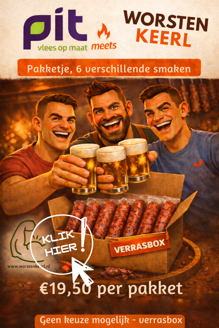Bij ons stel je zélf je pakket samen: 6 worsten (oftewel 3 setjes van 2).