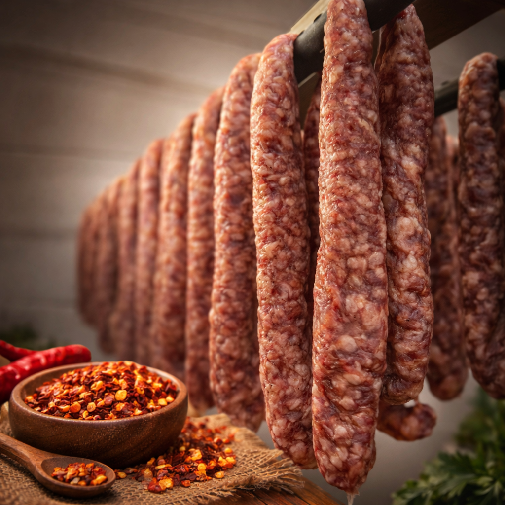 Droge worst Chili (chilivlokken toegevoegd) Minimaal 3 setjes voor verzending. Keuze uit verschillende smaken