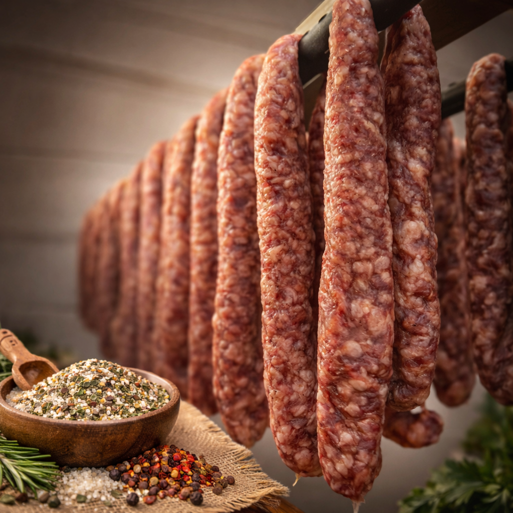Ambachtelijk bereid in onze eigen worstenmakerij, volgens ons unieke eigen recept.